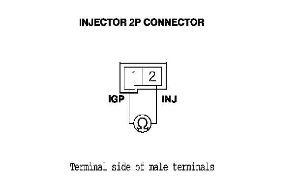 54. At the injector side, measure the resistance between injector 2P connector terminals No. 1 and No. 2.