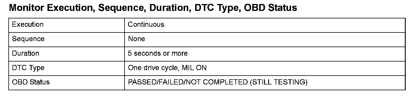 Monitor Execution, Sequence, Duration, DTC Type, OBD Status