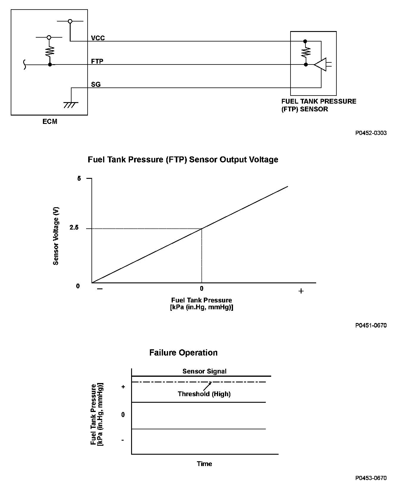 The fuel tank pressure (FTP) sensor is installed on the evaporative emission (EVAP) canister and detects the fuel tank pressure. The FTP sensor is used to detect leaks in the EVAP system. The engine control module (ECM) monitors the FTP sensor output voltage. The FTP sensor output voltage rises as the fuel tank pressure increases. Conversely, the FTP sensor output voltage drops as the fuel tank pressure decreases. If the FTP sensor output voltage is higher than a target value for a set time after starting the engine in a cold condition, the ECM detects a malfunction and stores a DTC.