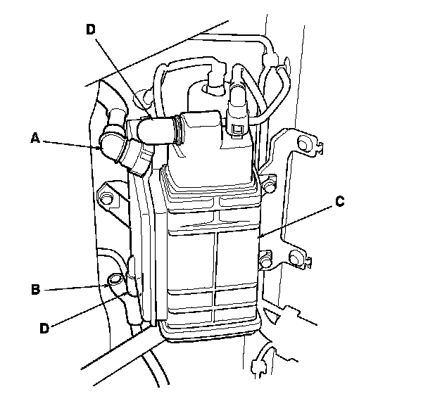 8. Disconnect the fuel tank vapor recirculation tube (A) and the fresh air hose (B) from the EVAP canister (C), and plug the EVAP canister ports (D).