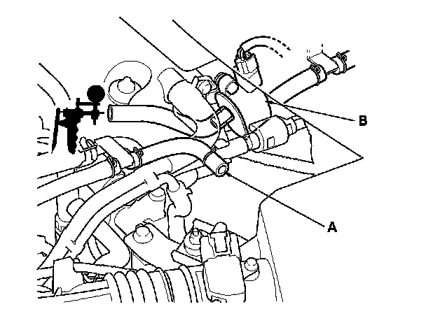 9. Disconnect the vacuum hose (engine side) (A) from the EVAP canister purge valve (B) in the engine compartment, and connect a vacuum pump/gauge, 0-30 in.Hg, to the purge valve as shown.