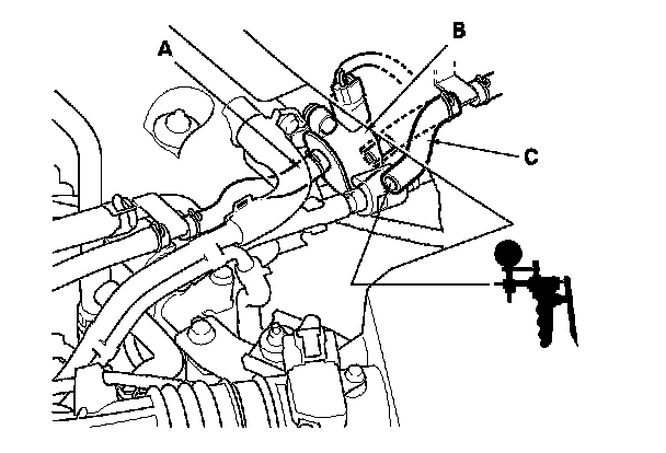 23. Reconnect the vacuum hose (engine side) (A) to the EVAP canister purge valve (B) and disconnect the vacuum hose (EVAP canister side) (C) from the EVAP canister purge valve, then connect a vacuum pump/gauge, 0-30 in.Hg, to the vacuum hose as shown.