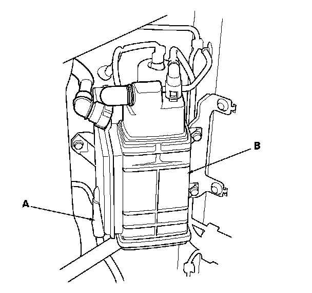 22. Reconnect the fresh air hose (A) to the EVAP canister (B).
