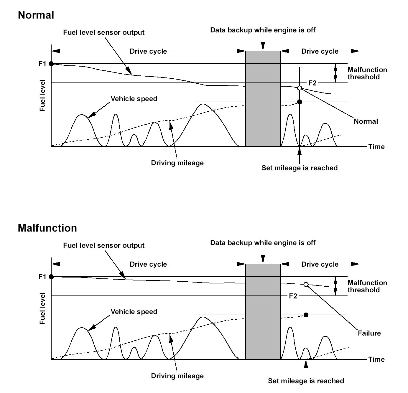 The fuel level sensor is incorporated with the fuel pump and installed in the fuel tank. Using a built-in potentiometer and float, it converts the movement of the float into electrical signals that correspond to the fuel level, and it indicates the amount of fuel in the fuel tank. If the engine control module (ECM)/powertrain control module (PCM) receives no change in the fuel level sensor output after driving for a specified number of miles, it detects a malfunction and stores a DTC.