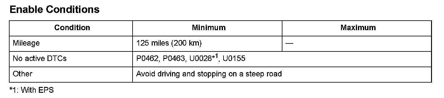 Drive for the specified mileage under Enable Conditions without refueling. (turning the ignition switch off is acceptable.)