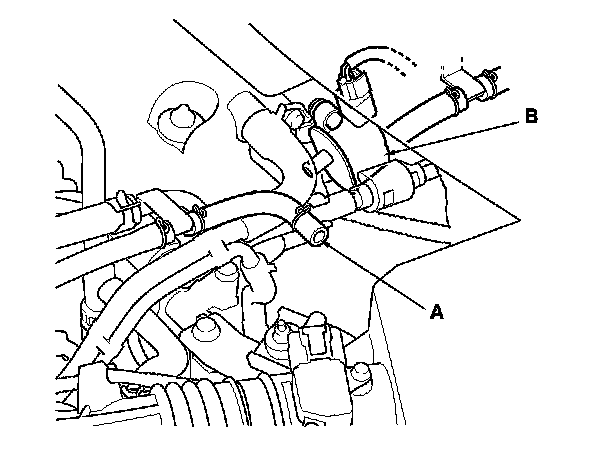 6. Disconnect the vacuum hose (A) from the EVAP canister purge valve (B).
