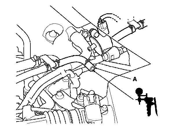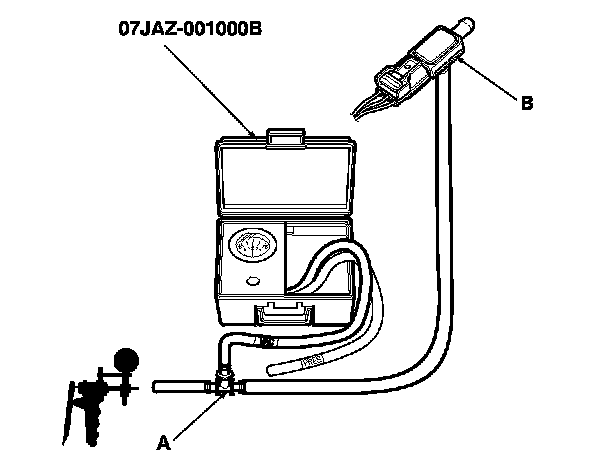 7. Disconnect the vacuum hose from the purge line (at the EVAP canister side), and connect a T-fitting (A) from the vacuum gauge and the vacuum pump/gauge, 0-30 in.Hg, to the hose as shown.