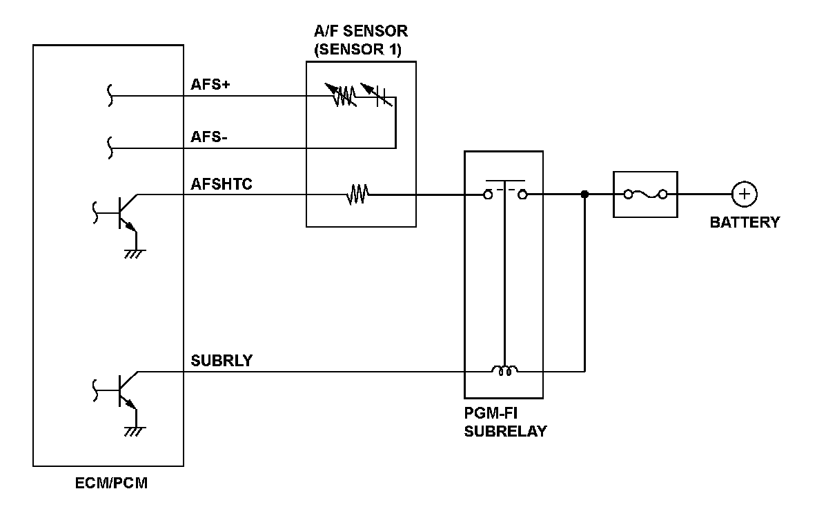 The air/fuel ratio (A/F) sensor (sensor 1) is installed in the exhaust system and detects oxygen content in the exhaust gas. The A/F sensor outputs voltage to the engine control module (ECM)/powertrain control module (PCM). A heater for the sensor element is embedded in the A/F sensor (sensor 1). When activated, it heats the sensor to stabilize and speed up the detection of oxygen content by controlling current flow through the heater. The current diminishes as the voltage applied to the element reaches a certain range because the amount of oxygen that passes through the diffusion layer is limited. The current is proportional to the oxygen content in the exhaust gas, so the air/fuel ratio is detected by the measurement of the current. The ECM/PCM compares the set target air/fuel ratio to the detected air/fuel ratio and adjusts the fuel injection duration. If the A/F sensor (sensor 1) voltage is low, the air/fuel ratio is lean, and the ECM/PCM uses A/F feedback control to issue a Rich command. If the A/F sensor (sensor 1) voltage is high, the air/fuel ratio is rich, and the ECM/PCM uses A/F feedback control to issue a Lean command. If the element is not activated for a set time when power is drawn by the A/F sensor (sensor 1) heater, a malfunction is detected and a DTC is stored.