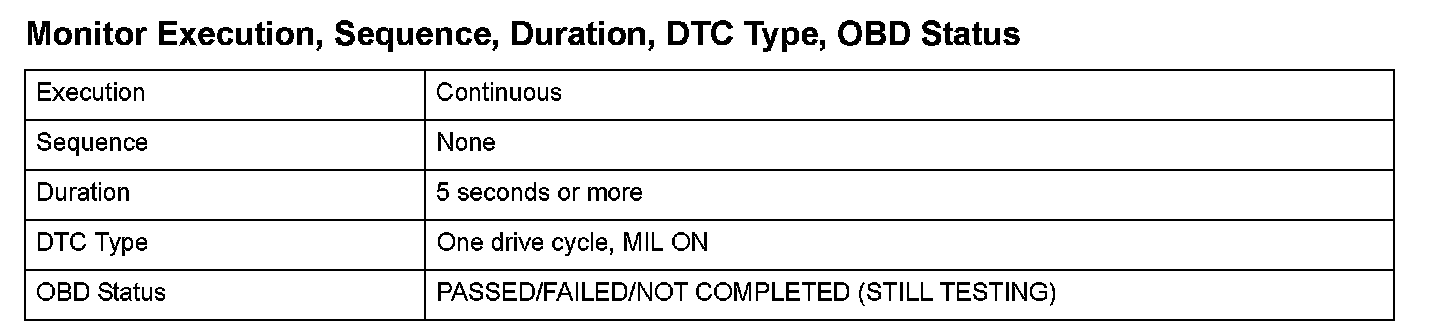 Monitor Execution, Sequence, Duration, DTC Type, OBD Status