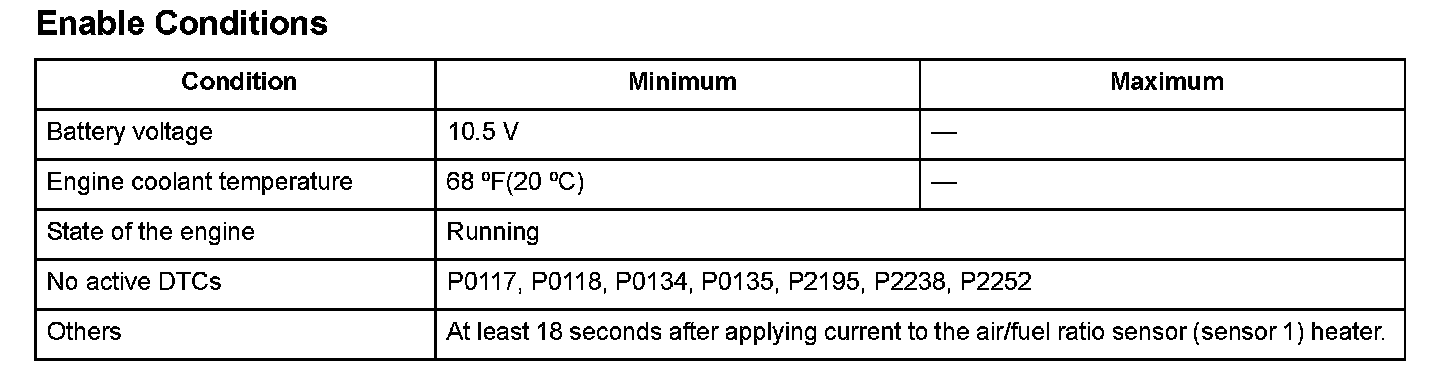 The A/F sensor (sensor 1) heater element resistance is 250 � or more for at least 5 seconds.