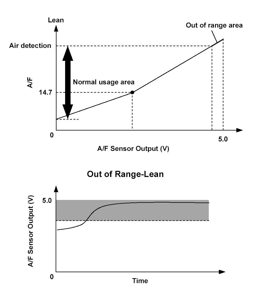 If a malfunction causes the air/fuel sensor value sent to the engine control module (ECM) to deviate from the normal control area, the air/fuel (A/F) sensor may still become active after the engine starts, but the air/fuel feedback does not start normally and the emissions deteriorate. When the A/F sensor output is out of the normal area, and this condition continues after the A/ F sensor is active, the ECM detects a malfunction and a DTC is stored.