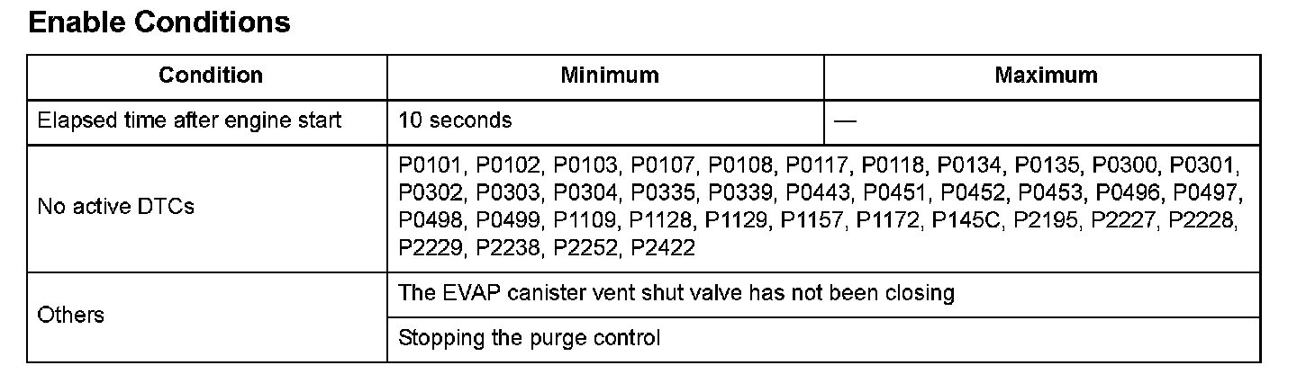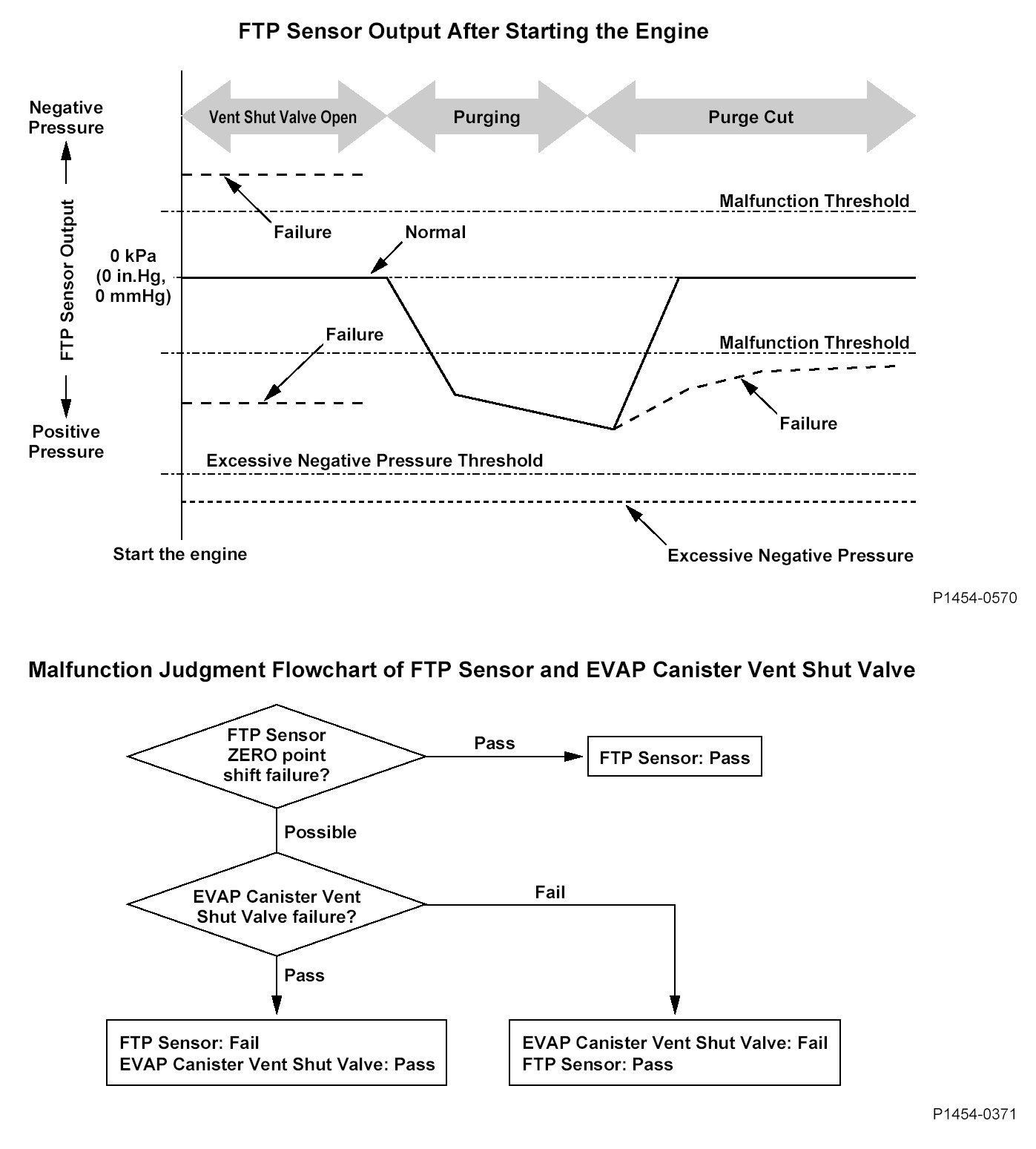 The fuel tank pressure is about 0 kPa (0 in.Hg, 0 mmHg) when starting a cold engine. When the fuel tank pressure (FTP) sensor output value is out of a specified range and the engine control module (ECM) judges that there's no other cause [no evaporative emission (EVAP) canister vent shut valve failure, etc.] for the FTP sensor zero point shift, the ECM detects an FTP sensor malfunction. However, if the FTP sensor output when starting the engine is a prescribed negative value or less (excessive negative pressure is detected), the malfunction judgment should be done as follows because it is difficult to distinguish the FTP sensor zero point shift (P1454) from the EVAP canister vent shut valve failure (P2422).