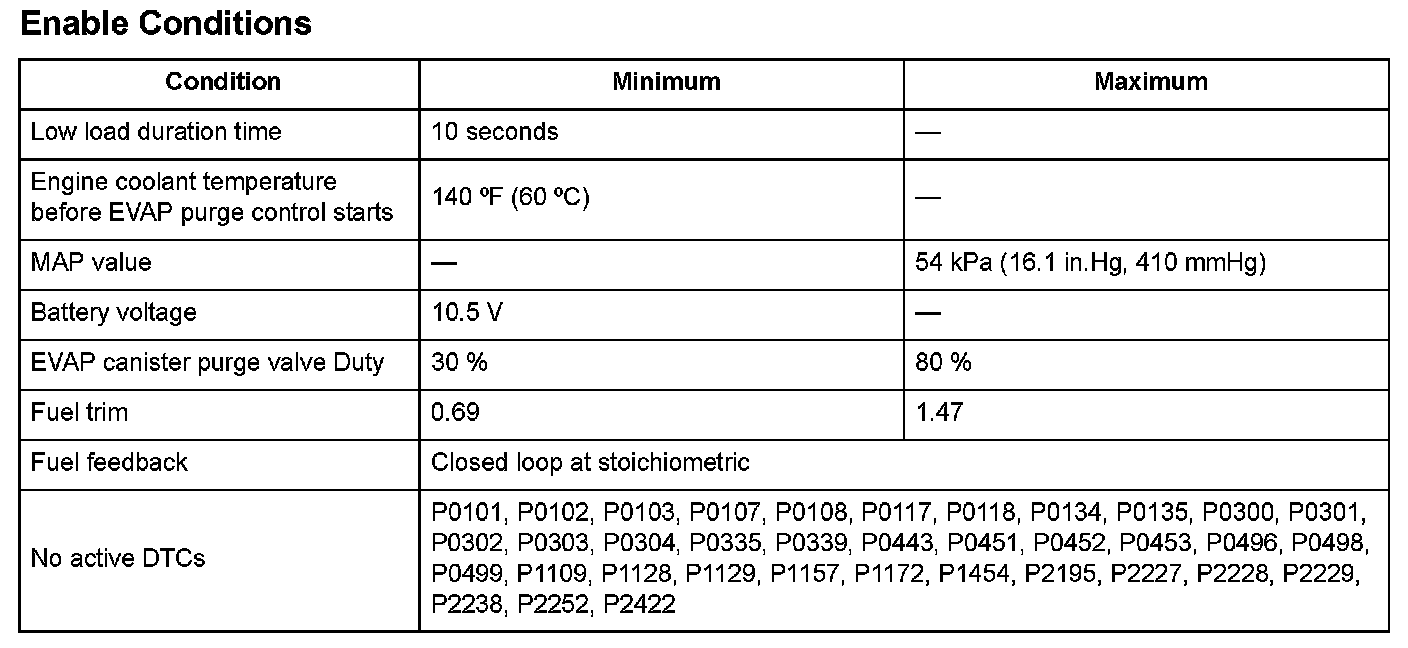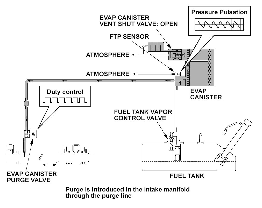 The fuel vapor in the fuel tank is temporarily stored in the evaporative emission (EVAP) and introduced in the engine through the EVAP canister purge valve. The engine control module (ECM) controls the amount of vapor introduced into the engine by varying the duty cycle to the EVAP canister purge valve according to the condition of the engine.