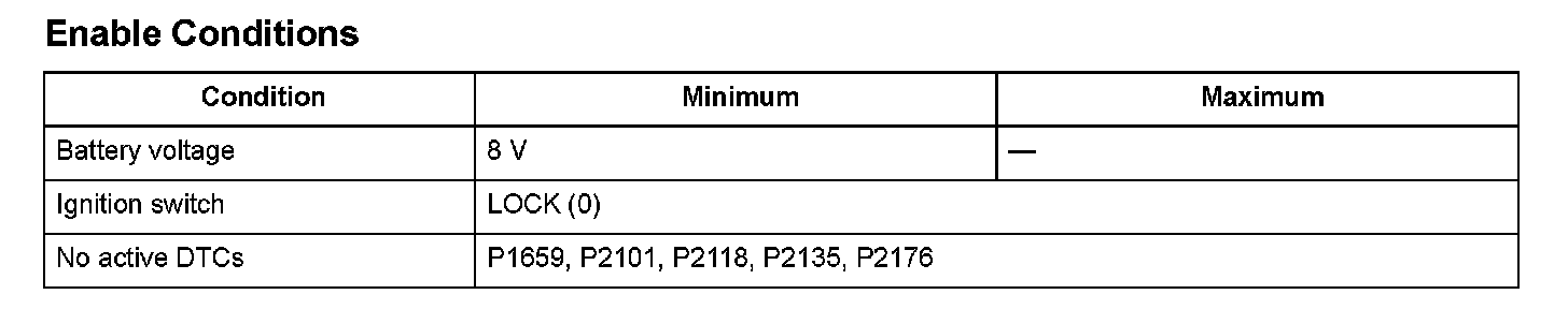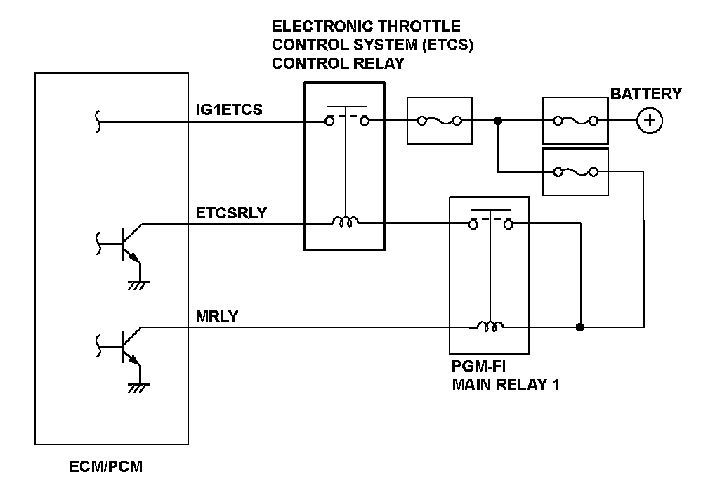 The engine control module (ECM)/powertrain control module (PCM) controls the throttle valve opening. The system includes the throttle actuator, the throttle valve, throttle position (TP) sensors A and B, the accelerator pedal position (APP) sensor, the electronic throttle control system (ETCS) control relay, and the ECM/PCM. The APP sensor is operated via the throttle cable to determine the accelerator opening value when the driver presses the accelerator pedal. The accelerator pedal opening value is converted to a signal in the APP sensor and transmitted to the ECM/PCM to compute the target position. The ECM/PCM determines the throttle valve target position according to the signal received and operates the throttle actuator to move the throttle valve to the target position. The actual throttle valve position is determined by TP sensor A (installed in the throttle body). When the voltage is applied from the ETCS control relay to the IG1ETCS terminal for a set time after the ETCS control relay is turned off, the ECM/PCM detects a malfunction in the ETCS control relay power switch and a DTC is stored.