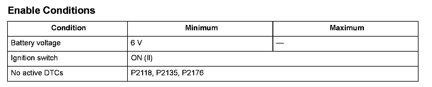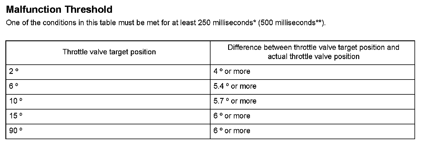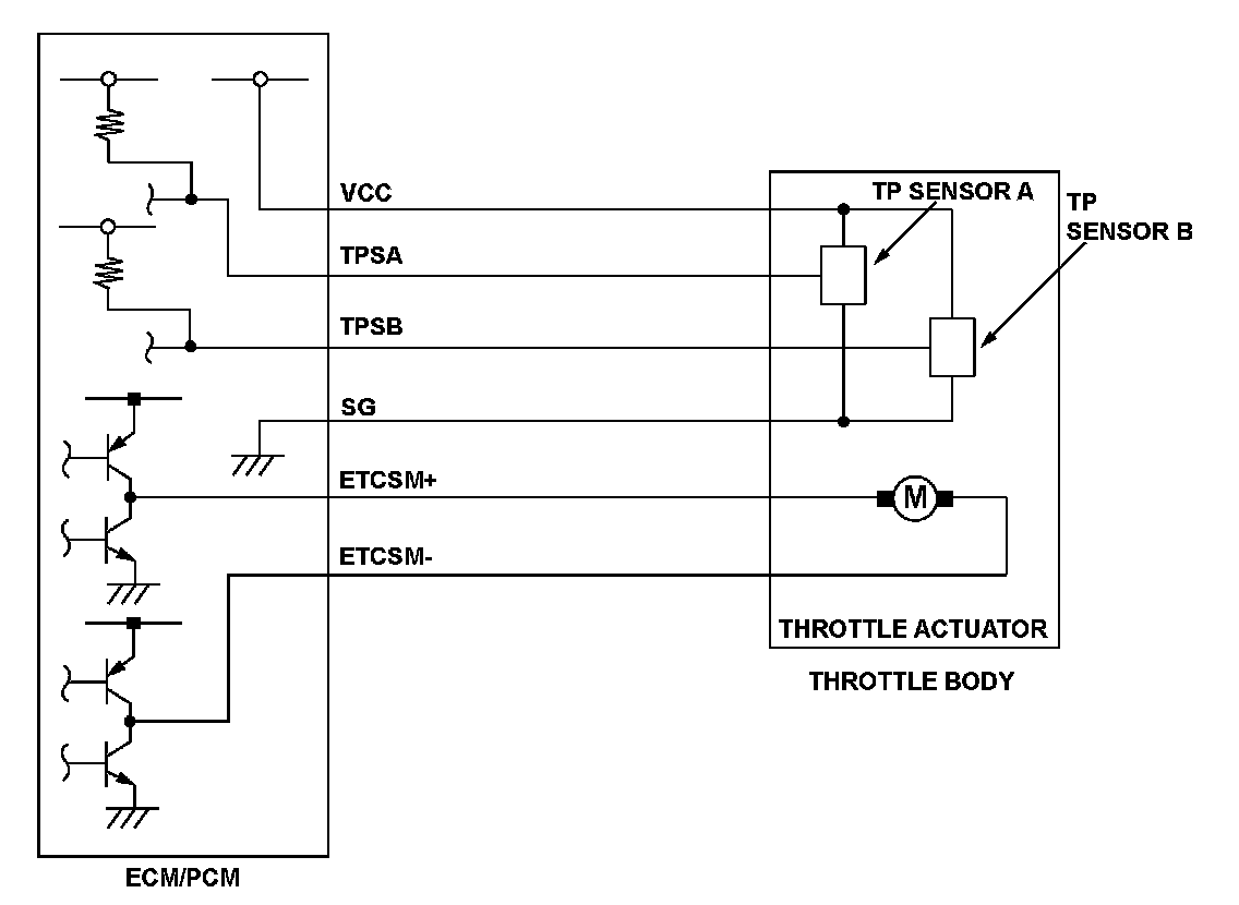 The electronic throttle control system (ETCS) controls the throttle valve opening. The system includes the throttle actuator, the throttle valve, throttle position (TP) sensors A and B, the accelerator pedal position (APP) sensor, and the engine control module (ECM)/powertrain control module (PCM). The APP sensor is operated via the throttle cable to determine the accelerator opening value when the driver presses the accelerator pedal. The accelerator pedal opening value is converted to a signal in the APP sensor and transmitted to the ECM/PCM to compute the target position. The ECM/PCM then operates the throttle actuator to move the throttle valve to the target position. The actual throttle valve position is determined by TP sensor A (installed in the throttle body). The ECM/PCM compares the throttle valve target opening angle and the actual throttle valve opening angle from TP sensor A, and when the difference exceeds the specification, the ECM/PCM detects the malfunction of the throttle actuator system and a DTC is stored.