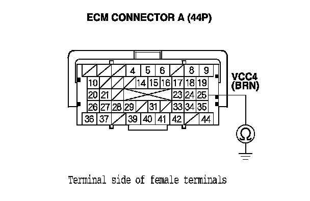 21. Check for continuity between ECM connector terminal A25 and body ground.