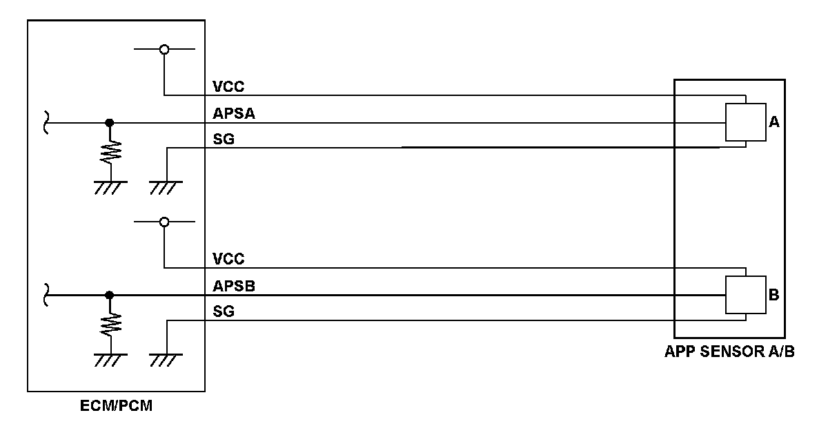 Accelerator pedal position (APP) sensor B is a part of the electronic throttle control system (ETCS). It is used to convert the position of the accelerator pedal into electrical signals. Based on these signals, the engine control module (ECM)/powertrain control module (PCM) controls the throttle actuator so that the throttle position agrees with the accelerator pedal position. If the signal voltage from APP sensor B is a set value or more, the ECM/PCM detects a malfunction and stores a DTC.