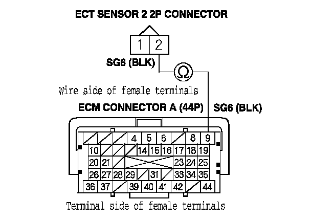 15. Check for continuity between ECT sensor 2 2P connector terminal No. 2 and ECM connector terminal A9.