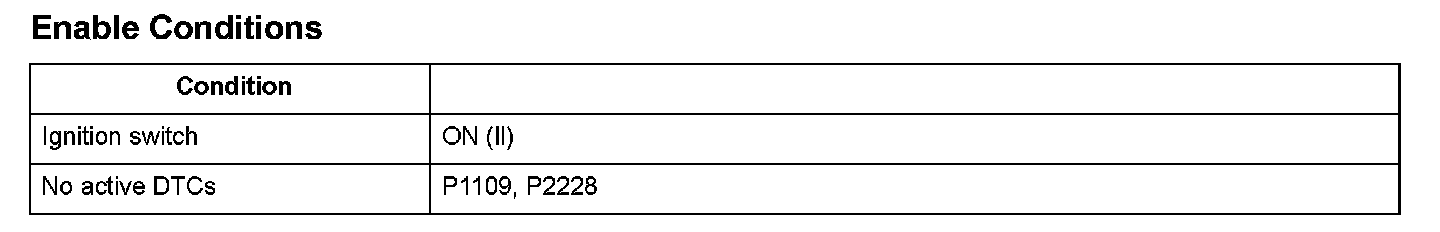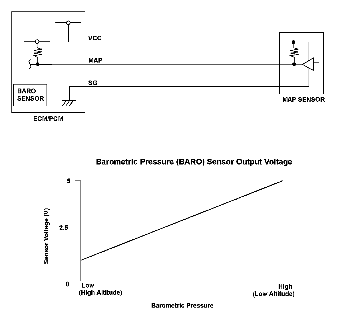 The barometric pressure (BARO) sensor is built into the engine control module (ECM)/powertrain control module (PCM) and monitors atmospheric pressure. The ECM/PCM estimates appropriate intake airflow from the manifold absolute pressure (MAP) sensor output voltage and BARO sensor output voltage. If the BARO sensor output voltage is a specified value or more, the ECM/PCM detects a malfunction and a DTC is stored.