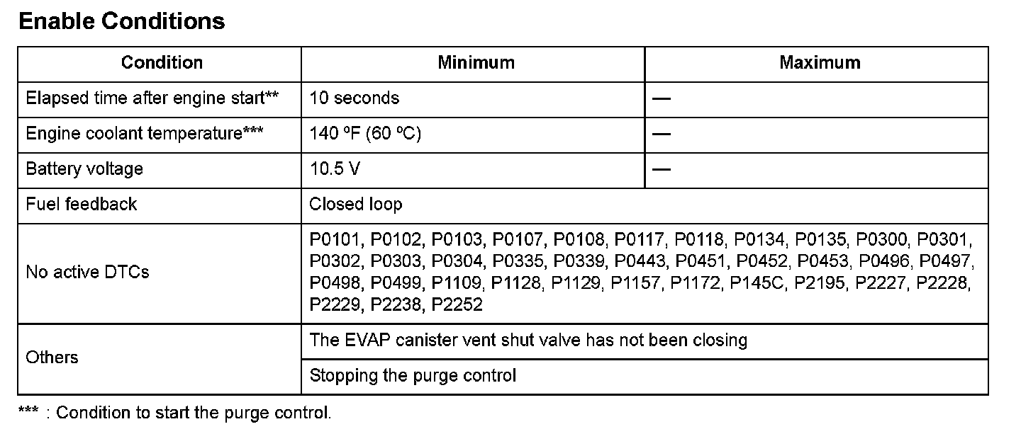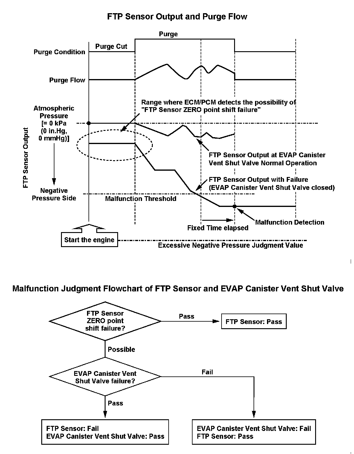 The fuel tank pressure (FTP) sensor output is near atmospheric pressure (0 kPa (0 in.Hg, 0 mmHg)) before purge starts since the evaporative emission (EVAP) canister vent shut valve is normally open (to the atmosphere). The sensor indicates a negative pressure value (vacuum) while purging. When the FTP sensor indicates vacuum after the engine starts, an FTP sensor zero point shift failure or an EVAP canister vent shut valve stuck closed can occur. To prevent these failures, the Engine control module (ECM) monitors the FTP sensor output after purge starts. The ECM detects a malfunction of the EVAP canister vent shut valve if the output indicates excessive vacuum. However, if the fuel tank internal pressure is below the specified value (excessive vacuum is detected) when starting the engine, the malfunction detection should be done as follows because it is difficult to distinguish between FTP sensor range problem (P1454) and an EVAP canister vent shut valve stuck closed problem (P2422).