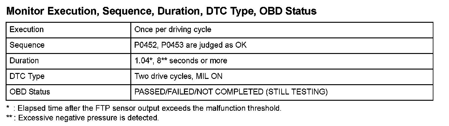 The output from the fuel tank pressure sensor is -4 kPa (-1.0 in.Hg, -25 mmHg)*, -2 kPa (-0.4 in.Hg, -10 mmHg)** or less for at least 1.04*, 8** seconds.