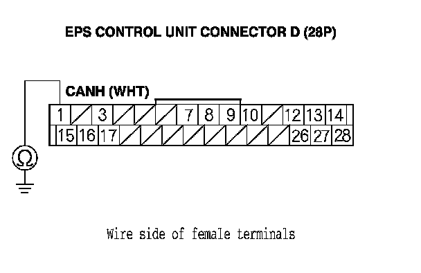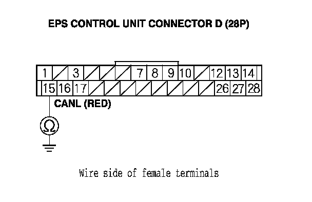 13. Check for continuity between EPS control unit connector D (28P) terminal No. 15 and body ground.