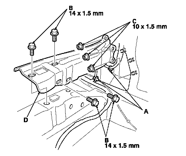 5. Remove the bolts (B) and the nuts (C), then remove the middle cross-member gusset (D).
