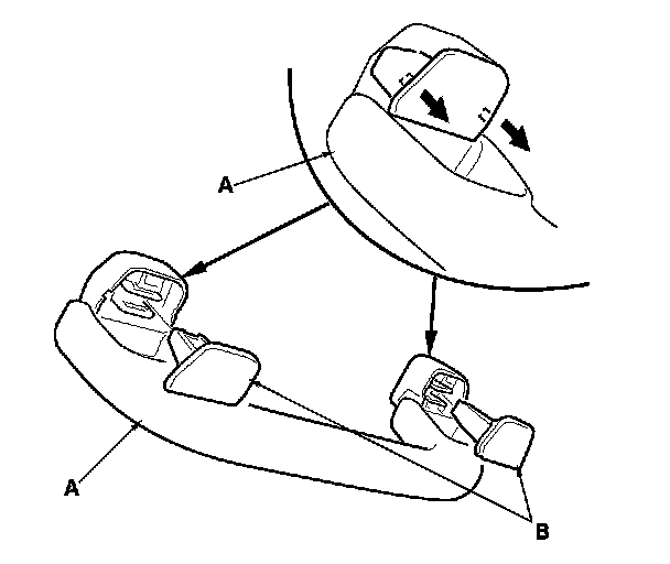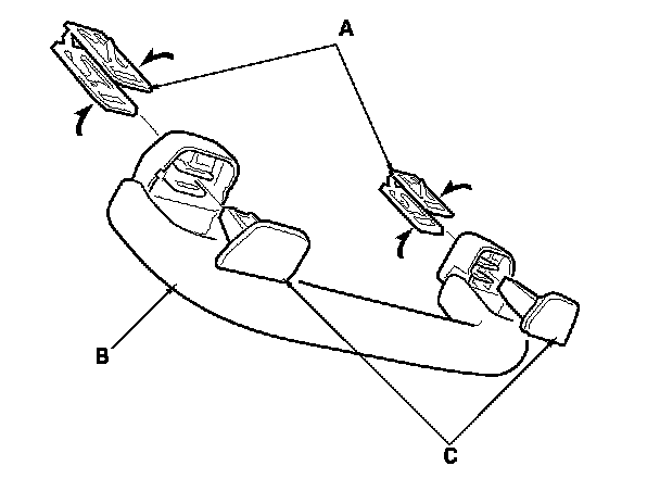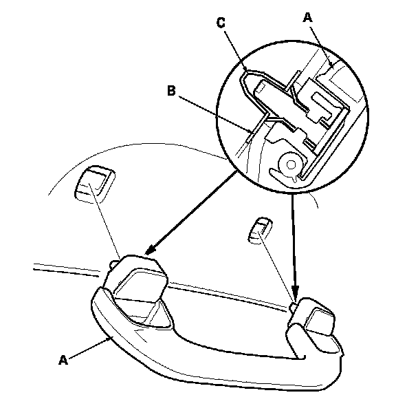 2. While pinching the clips (A), release the hooks (B), then remove the grab handle (C).