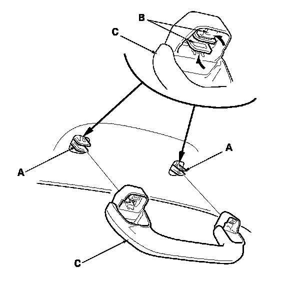 6. Install the clips (A) to the grab handle (B), then install the stoppers (C) fully into the clips.