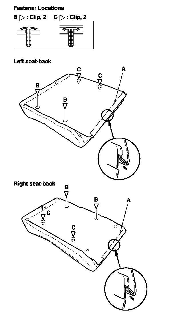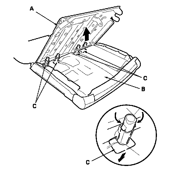 8. Pull out the seat-back frame (A) from the pad (B), then pinch the tabs on the ends of the head restraint guides (C), and remove them from the seat-back. The left seat-back is shown; the right seat-back is similar.