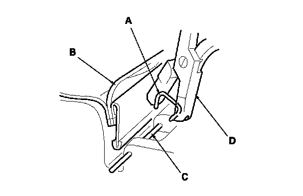 - Replace all of the upholstery rings (A) fastening the seat-back cover (B) and pad wire (C) with new ones using commercially available upholstery ring pliers (D).