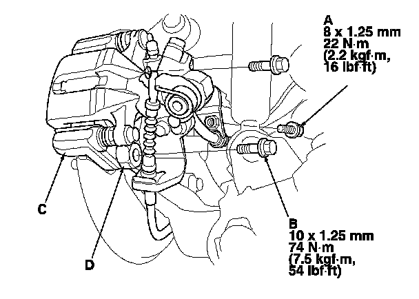 5. Remove the brake caliper bracket mounting bolts (B), then remove the caliper assembly (C) from the knuckle. To prevent damage to the caliper assembly or brake hose, use a short piece of wire to hang the caliper assembly from the undercarriage. Do not twist the brake hose and the parking brake cable excessively.