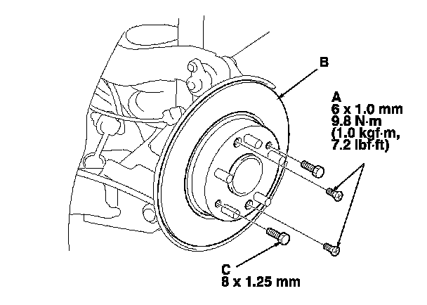 NOTE: If the brake disc is stuck to the hub bearing unit, thread two 8 x 1.25 mm bolts (C) into the brake disc to push it away from the hub bearing unit. Turn each bolt 90 degrees at a time to prevent the brake disc from binding.