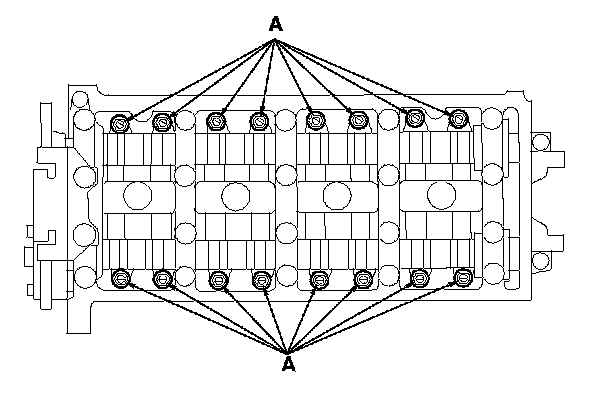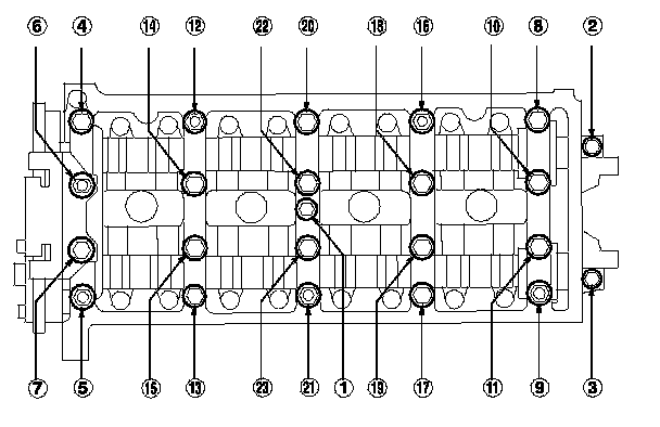 3. Remove the camshaft holder bolts. To prevent damaging the camshafts, loosen the bolts, in sequence, two turns at a time.