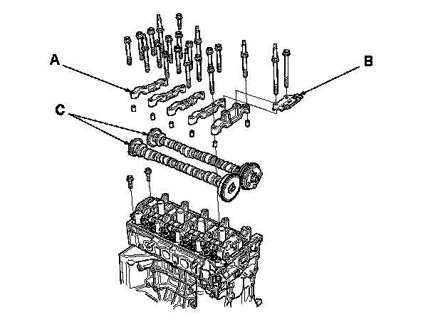4. Remove cam chain guide B, the camshaft holders (A), and the camshafts (C).