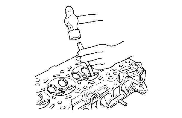 5. Working from the camshaft side, use the driver and an air hammer to drive the guide about 2 mm (0.1 in.) towards the combustion chamber. This will knock off some of the carbon and make removal easier. Hold the air hammer directly in line with the valve guide to prevent damaging the driver.