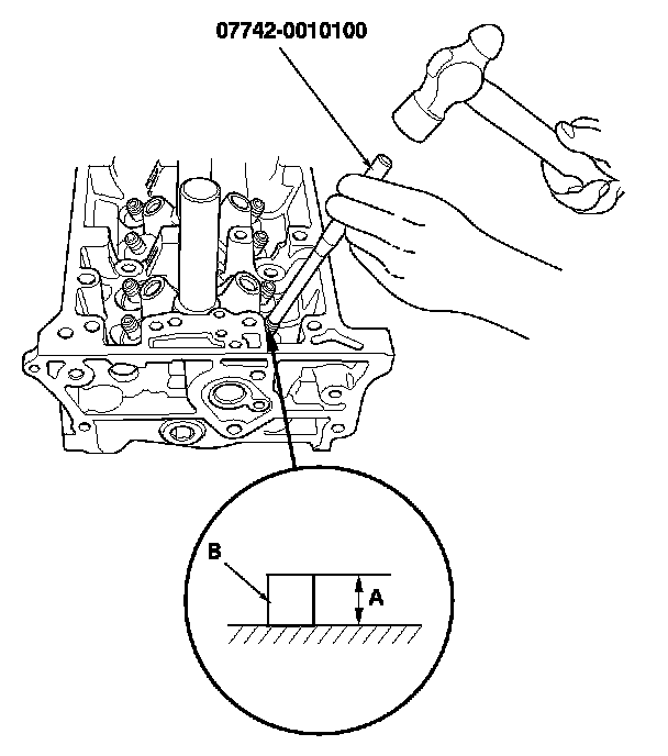 9. Apply a thin coat of new engine oil to the outside of the new valve guide. Install the guide from the camshaft side of the head, use the valve guide driver to drive the guide in to the specified installed height (A) of the guide (B). If you have all 16 guides to do, you may have to reheat the head.
