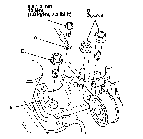 4. Install the side engine mount bracket, loosely tighten the new bolt and nut (C), then loosely tighten the bolt (D).