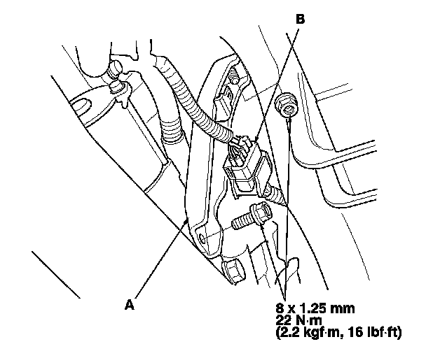 3. Install the intake manifold bracket (A), then install the connector (B) to the intake manifold bracket.