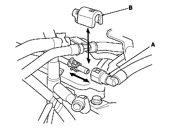 8. Remove the quick-connect fitting cover (A), then disconnect the fuel feed hose (B). Fuel Line/Quick-Connect Fitting Removal