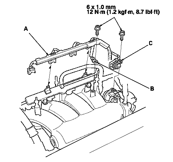 1. Connect the water bypass hose (A) to the intake manifold (B), then install the intake manifold with a new gasket (C), and tighten the bolts and the nuts in a crisscross pattern in three steps, beginning with the inner bolt.