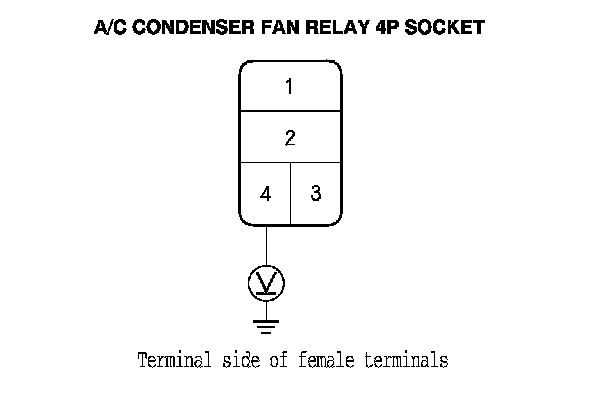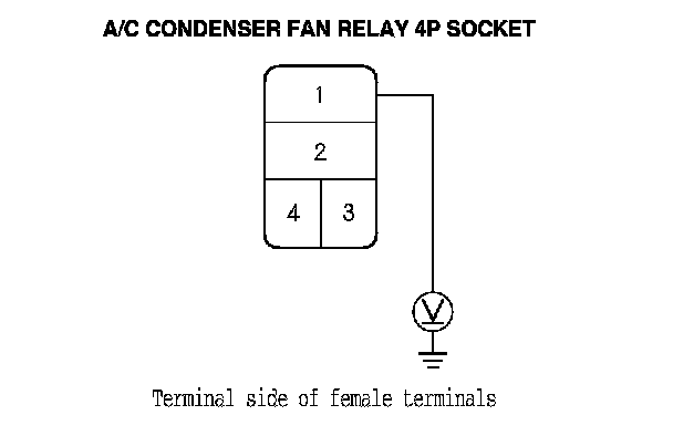 3. Measure the voltage between the A/C condenser fan relay 4P socket terminal No. 1 and body ground.