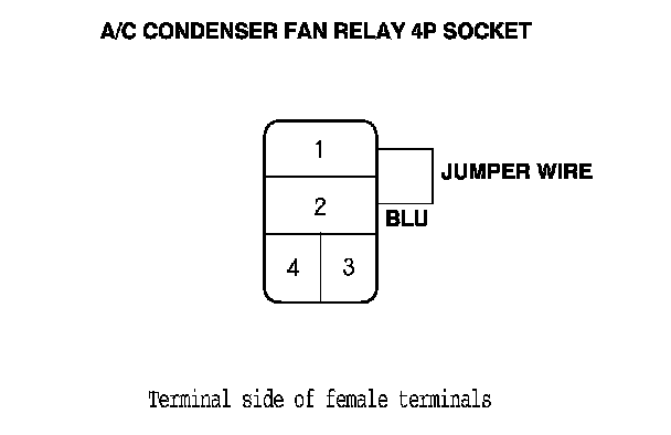 4. Connect the A/C condenser fan relay 4P socket terminals No. 1 and No. 2 with a jumper wire.