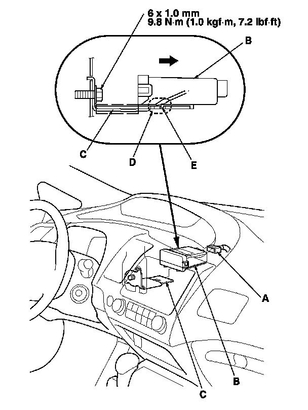 NOTE: While separating the TPMS control unit from the bracket, add in a flat-tipped screwdriver between the TPMS control unit and the bracket at shown aria (D) to release the hook (E), and slide out the TPMS control unit from the bracket.