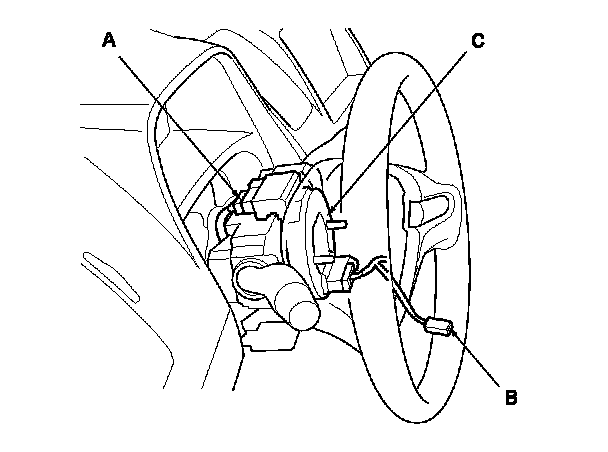 5. Remove the driver's airbag assembly, Drivers Airbag Replacement and disconnect the horn switch 1P positive terminal (B) from the cable reel (C).