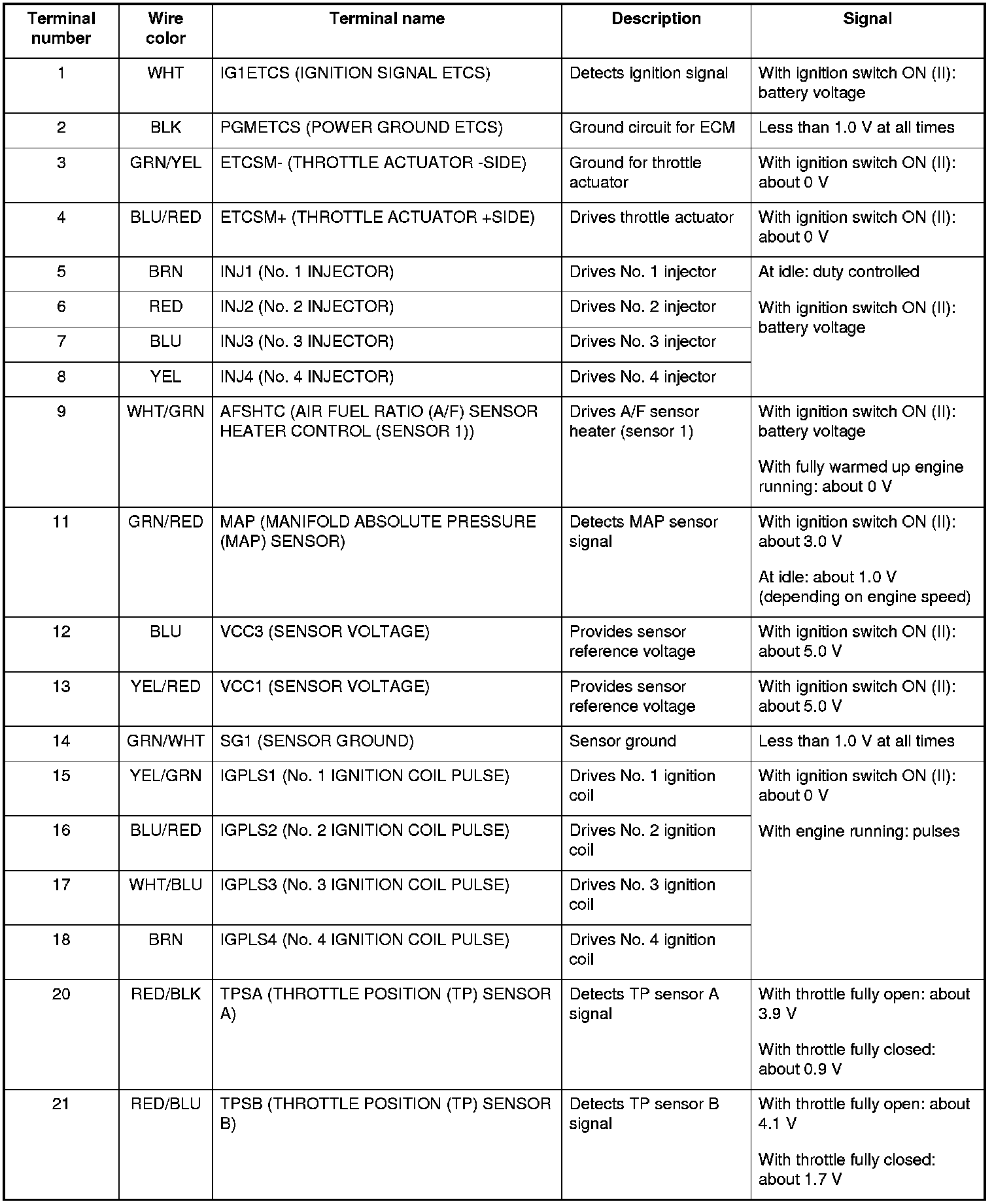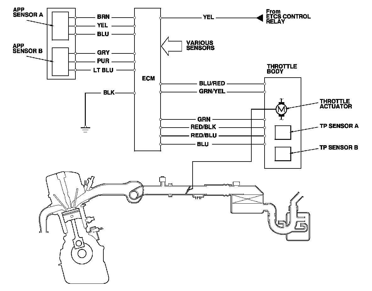 The electronic throttle control system consists of the throttle actuator, throttle position (TP) sensor A/B, accelerator pedal position (APP) sensor A/B, the electronic throttle control system (ETCS) control relay, and the ECM.