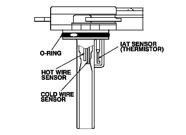 The mass air flow (MAF) sensor/intake air temperature (IAT) sensor contains a hot wire sensor, a cold wire sensor, and a thermistor. It is located in the intake air passage. The resistance of the hot wire sensor, a cold wire sensor, and thermistor changes due to intake air temperature and air flow. The control circuit in the MAF sensor controls the current to keep the hot wire at a set temperature. The current is converted to voltage in the control circuit, then output to the ECM.