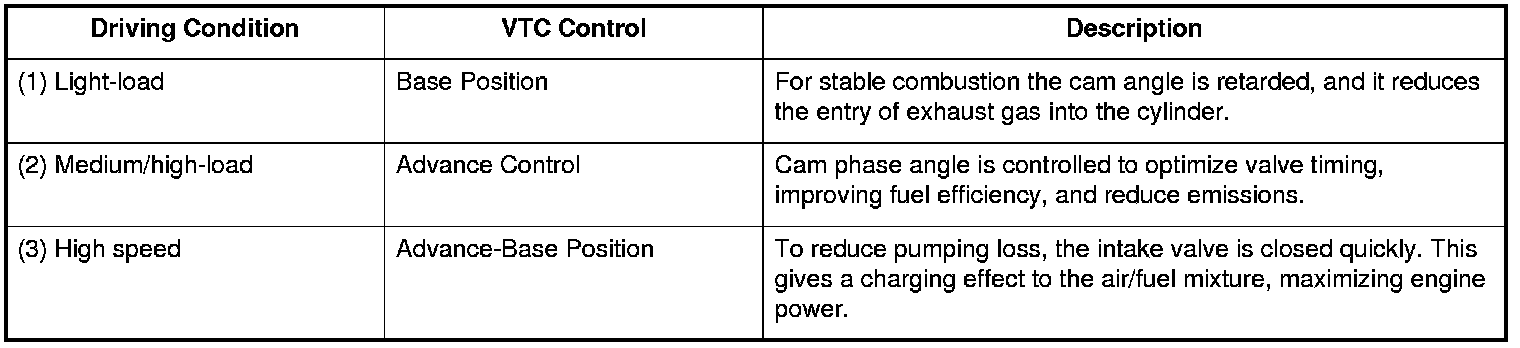 - The VTC system makes continuous intake valve timing changes based on operating conditions.