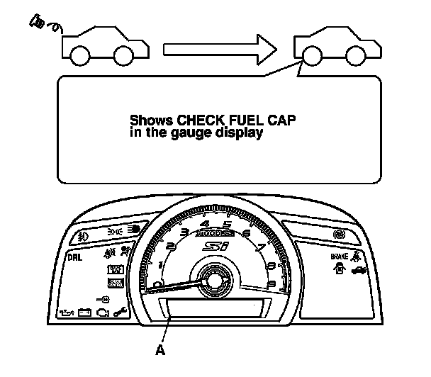 The first time a leak is detected, a CHECK FUEL CAP message is shown in the gauge display (A). To scroll to another message, press the select/reset button. The CHECK FUEL CAP message appears each time you restart the engine until the system turns the message off. Turn the engine off, then replace or tighten the fuel fill cap until clicks at least once.