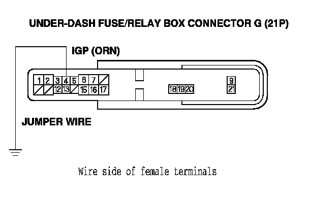 10. Connect under-dash fuse/relay box connector G (21P) terminal No. 4 to body ground with a jumper wire.